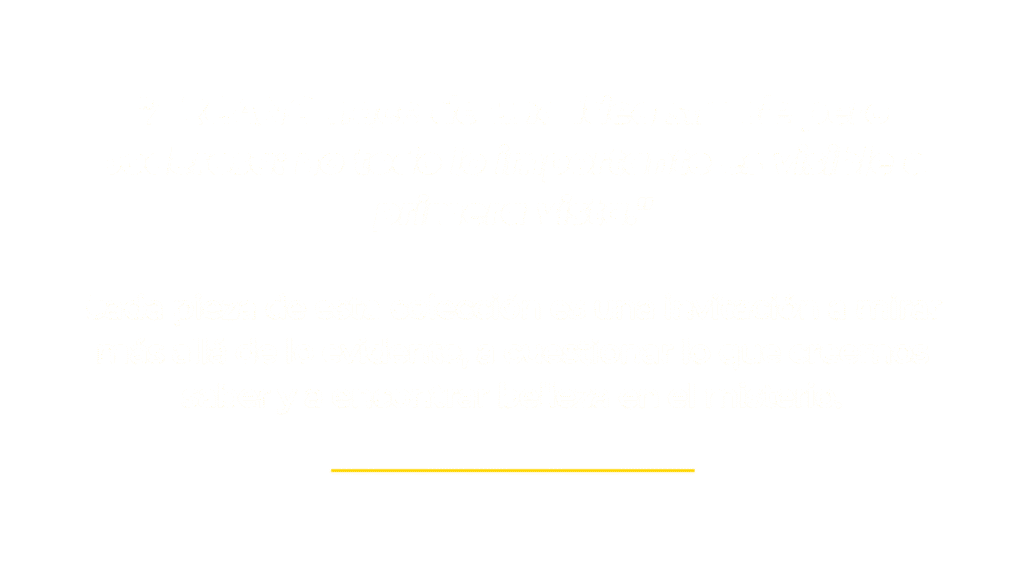 EXPLORAR LA COLECCION Universe Series 01 La Colección Universe Series 01El ObservadorVer pieza Universe Series 01ÓrbitaVer pieza Universe Series 01SistemaVer pieza Universe Series 01No Estamos SolosVer pieza Universe Series 01El VisitanteVer pieza Universe Series 01ContactoVer pieza Universe Series 01Más AlláVer pieza Universe Series 01ARCANOVer pieza